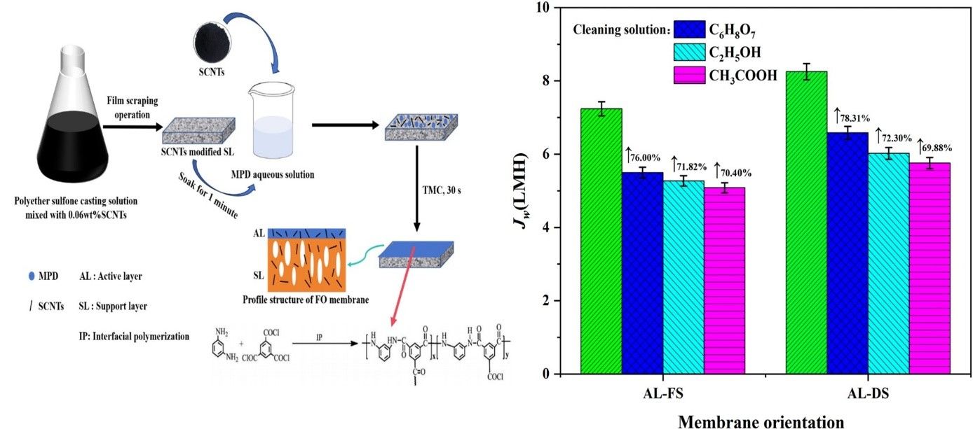 为了进一步提高所制备膜的抗污染能力,将磺化碳纳米管同时作用于正渗透膜活性层与支撑层,成功制备出了一种新型正渗透膜,并在《应用化工》期刊发表题为“磺化碳纳米管改性聚酰胺类正渗透膜的制备及表征”的研究论文,2022级环境工程专业研究生朱仲翊为论文第一作者,导师崔红涛为通讯作者。随后对所制备正渗透膜的性能进行了渗透性、选择性与抗污染性评估,发现膜同时具备优异的渗透性能及抗污染性能,并在国际会议The International Conference on Green Energy and Environmental Systems (GEES 2025)发表研究论文“Performance evaluation on the forward osmosis membrane modified by sulfonated carbon nanotubes”。2022级环境工程专业研究生朱仲翊为论文第一作者,导师崔红涛为通讯作者。