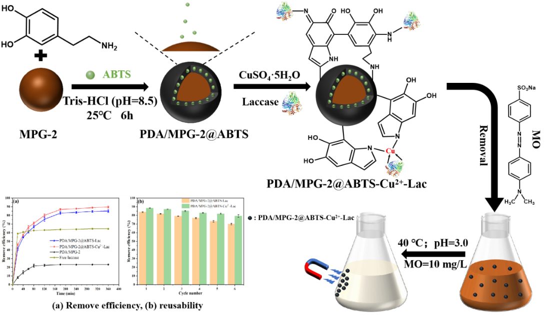 为进一步提升酶载量,采用盐酸多巴胺(PDA)作为界面功能分子,利用其强黏附性和丰富的官能团,对MPG-2进行表面涂层修饰,并实现了介体ABTS与漆酶的共固定化。所构建的固定化体系PDA/MPG-2@ABTS-Lac和PDA/MPG-2@ABTS-Cu²⁺-Lac均表现出高载酶量(分别为62.1 mg/g和61.3 mg/g)和高活性回收率(分别为107.9%和135.1%)。在模拟废水降解实验中,两种体系均能在3小时内实现85%以上的甲基橙去除率。此外,固定化酶在高温、宽pH范围以及多次循环催化过程中均表现出优异的稳定性,显示出在实际废水处理应用中的巨大潜力。本研究为开发高效、稳定的酶基水净化材料提供了新的策略和技术基础。研究成果以“Cu²⁺-Enhanced Magnetic Mediator–Laccase Co-Immobilized System for Efficient Methyl Orange Degradation in Wastewater”为题发表于国际期刊《Journal of water process engineering》,潘虹老师为第一作者,生物化工专业2023级研究生戴宜轩为第二作者,王晓军老师为通讯作者,国产无码 为通讯单位。