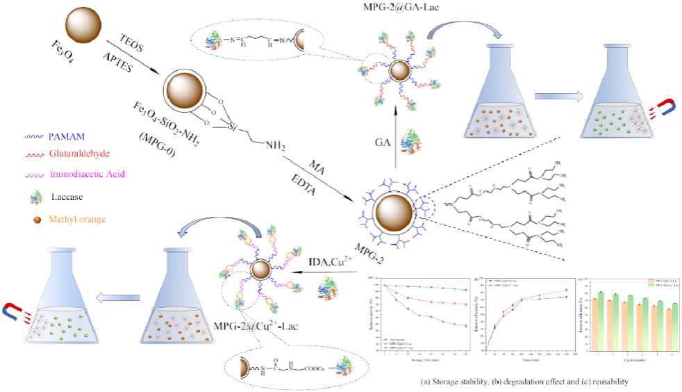 在传统的染料废水处理中,甲基橙作为典型的难降解有机污染物,一直是治理的重点与难点。虽然漆酶作为一种绿色催化剂在染料脱色方面潜力巨大,但游离漆酶稳定性差、难以回收的弊端长期制约着其工业化应用。针对这一瓶颈,王晓军副教授、潘虹博士团队以四氧化三铁为核,通过在其表面修饰超支化聚酰胺-胺树状大分子,创新性地构建了一种新型磁性树状大分子,并通过不同方法制备了两种固定化漆酶,用于甲基橙染料的去除。发现6次循环操作后仍能保持固定化漆酶仍能保持66.18%的甲基橙去除效率。研究成果以“Preparation of Magnetic Dendrimer and Immobilization of Laccase for Methyl Orange Dye Removal”为题发表于国际期刊《BioNanoScience》,材料与化工专业2022级研究生陆天炆为第一作者,潘虹老师为通讯作者,国产无码 为通讯单位。