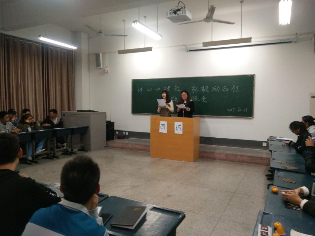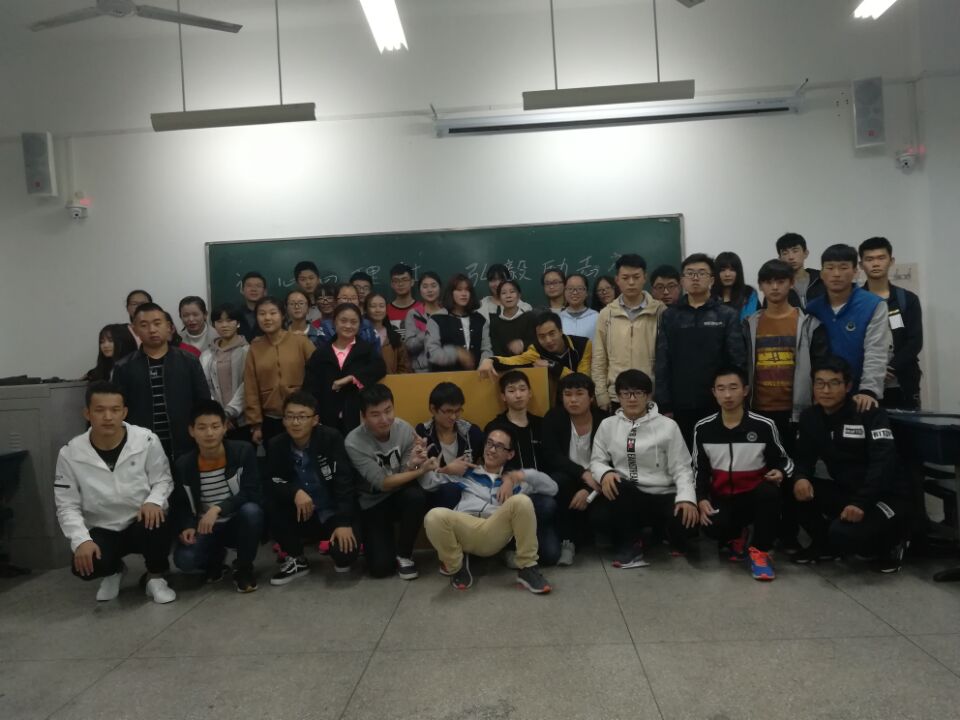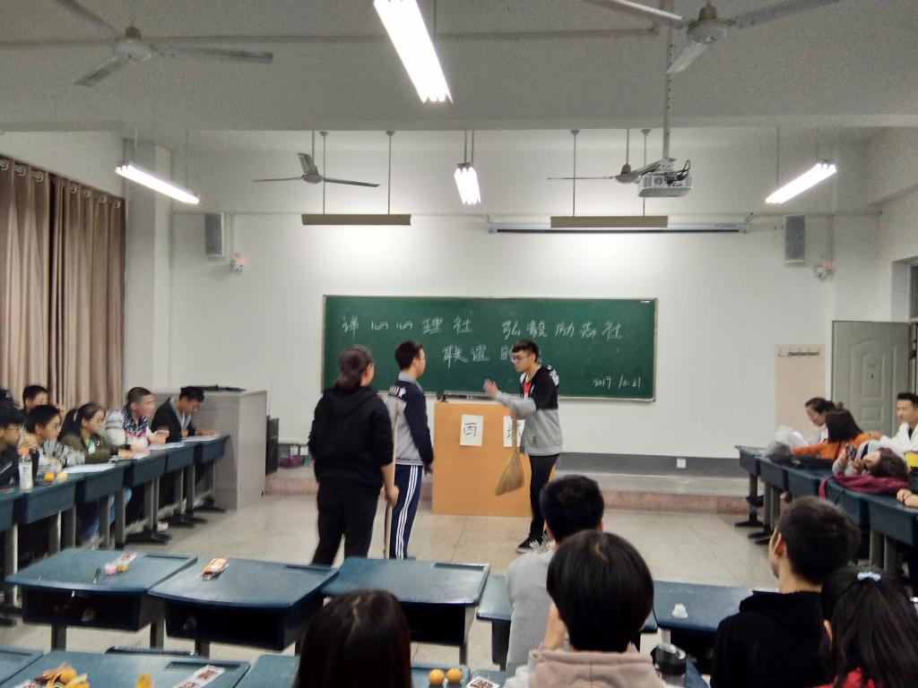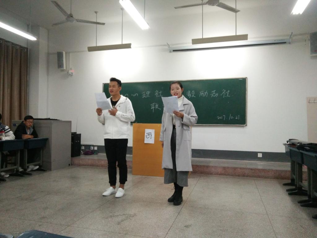 译心心理社与弘毅励志社于2017年10月21日在c374教室特别举办联谊晚会活动,联络全体社员的感情,增强集体合作能力和集体荣誉感。在主持人精彩致开场词后,由弘毅励志社17级成员带来小品《空城计》,紧接着由译心心理社部长带来相声《我的大学生活是这样的》,诗朗诵《我的南方与北方》,他们精彩的表演赢得了阵阵掌声。紧接着我们举办了抢凳子小游戏,各类节目赏心悦目,精彩纷呈。在活动最后,译心心理社和弘毅励志社成员集体合影,庆祝两社团联谊活动圆满结束。