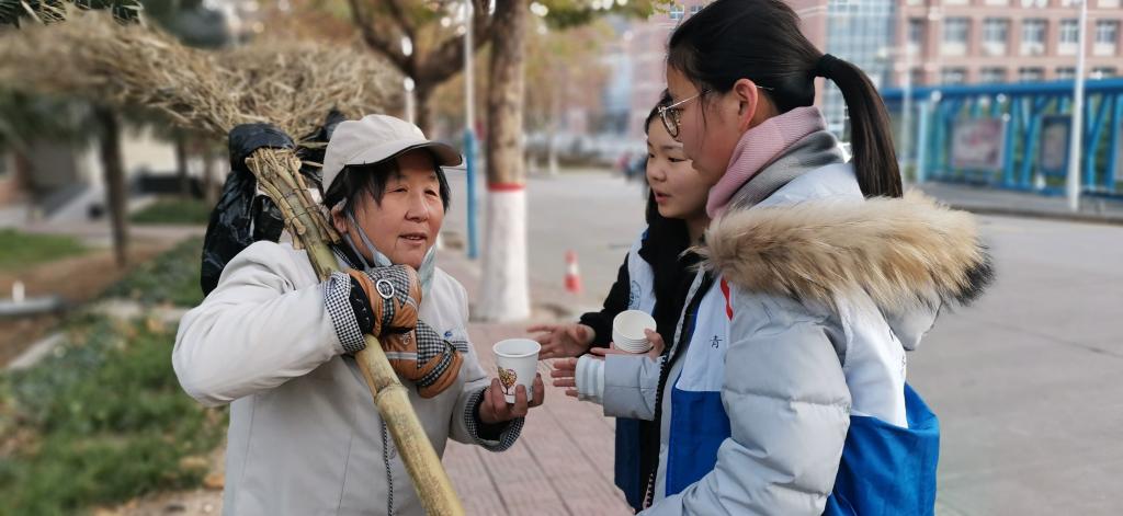 活动中,志愿者们首先分为两组,穿着志愿者马甲分别在校园内与华清池景区外进行志愿活动。志愿者们为在路边辛勤劳动的清洁工、保安们送上热水并慰问他们工作情况,同时表示感谢。同时,被慰问的工作者对志愿者们的到来与行为表示感谢,并十分热情的回应他们的问候。志愿者们的行为在寒冷的冬日里为人们带来温暖,同时他们也在与劳动者的交谈中收获了许多惊喜与感动。