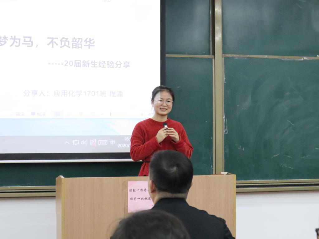 的基本情况进行了简要的介绍,他希望同学们在未来不仅能取得学业上的成功,更能保持执着专注,在磨砺中成就自我。最后,国家奖学金获得者、2017级应用化学1班程潘代表在校学生发言,她分享了自己在大学生活、学习的经历,并鼓励大家要有目标、有决心、不断上进。