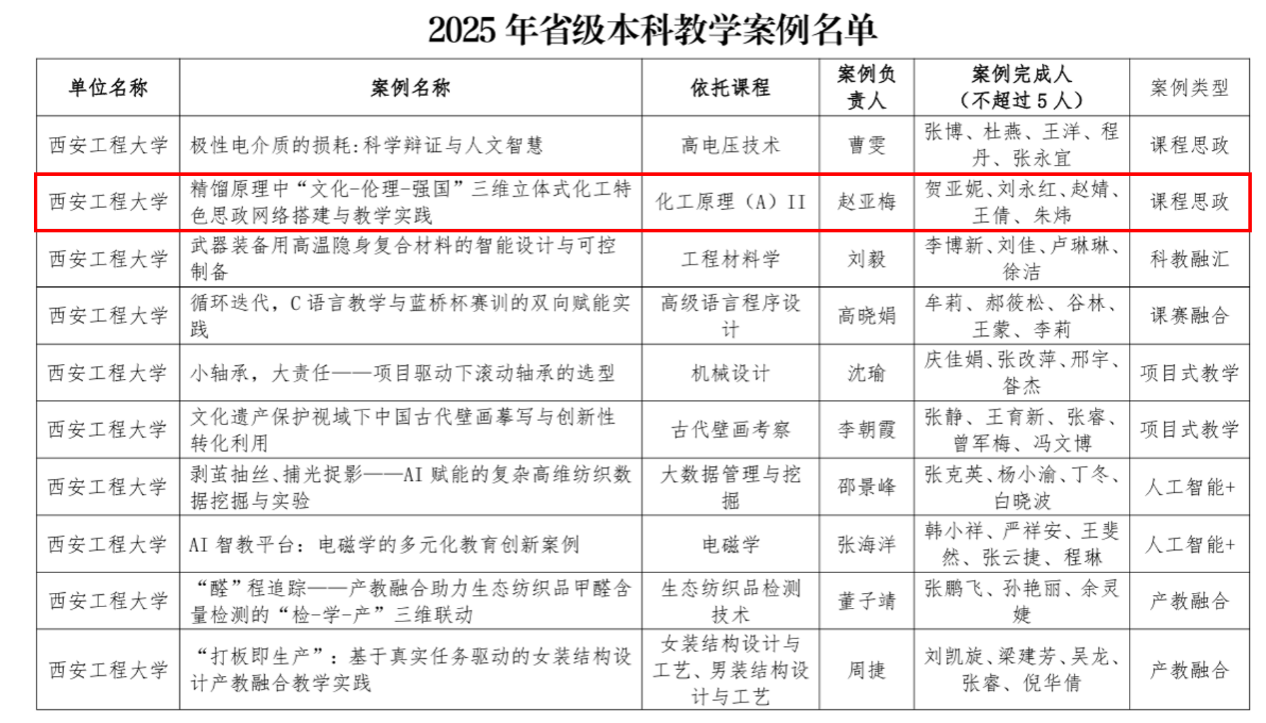 近日,陕西省教育厅公布2025年省级本科教学案例评选结果,国产无码 赵亚梅教授教学团队申报的《精馏原理中“文化-伦理-强国”三维立体式化工特色思政网络搭建与教学实践》案例成功入选,为国产无码 教学改革再添一项省级标志性成果。