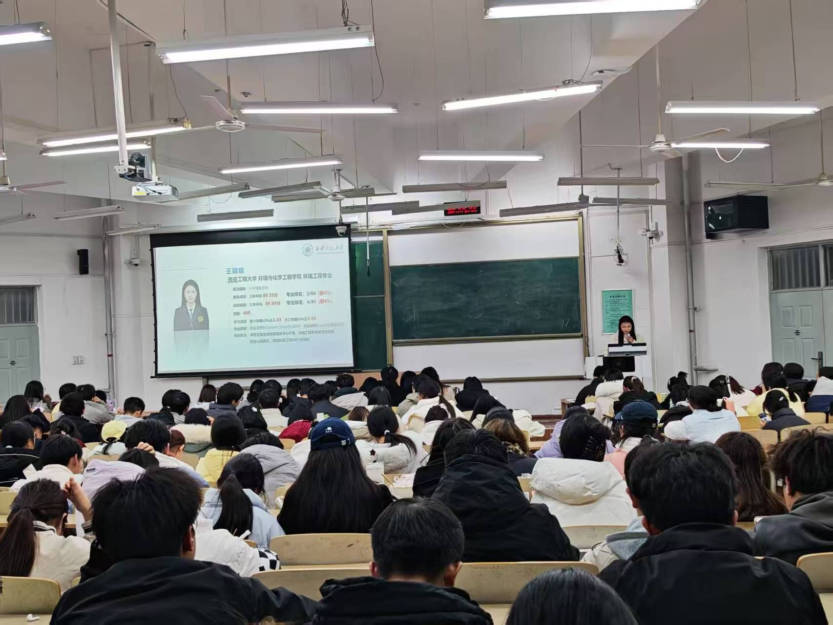 在经验分享环节,应用化学专业常心仪围绕“绩点与科研的双重赋能”展开讲述,强调了专业成绩在保研过程中的基础性作用,并结合自身参与大创项目及发表论文的经历,鼓励同学们主动投身科研,提升创新实践能力。生物工程专业李冬豪聚焦“夏令营与预推免”,系统介绍了“冲刺—稳妥—保底”相结合的梯度择校策略。他特别提到,自己在求学过程中多次受到学校各类奖助政策的支持,因此更加珍惜机会,奋发前行。应用化学专业索欣歌针对低年级同学的困惑,提出分阶段规划建议:大一首重基础课程与绩点积累,大二积极参与科研竞赛,大三精准投递与备战面试。她还分享了在国家奖学金、助学金等资助政策的帮助下,顺利完成学业并成功保研的励志经历。化学工程与工艺专业薛宇昊则围绕面试环节,细致讲解了专业问题应答与科研经历陈述的相关技巧与注意事项。