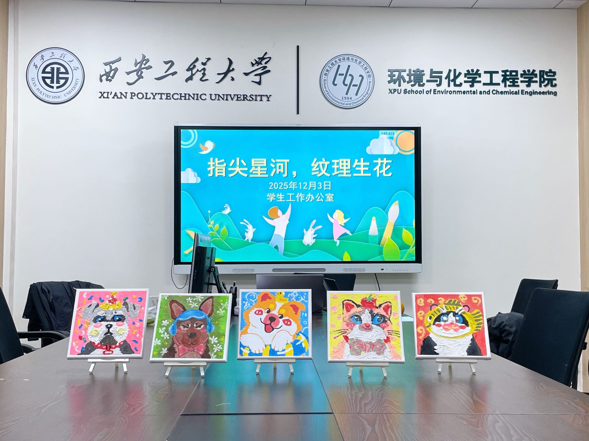 活动中,同学们在任子瑜老师的逐步引导下,亲自体验肌理画的创作过程。从色彩的调和到纹理的堆叠、刮抹,每一处手工的痕迹都成为情绪抒发的路径。大家专注于指尖的触感与视觉的流动,逐渐放松紧绷的神经,沉浸于艺术创作带来的宁静与愉悦。最终完成的一幅幅独特画作,不仅是创意的展现,更是内心状态的温柔外化。