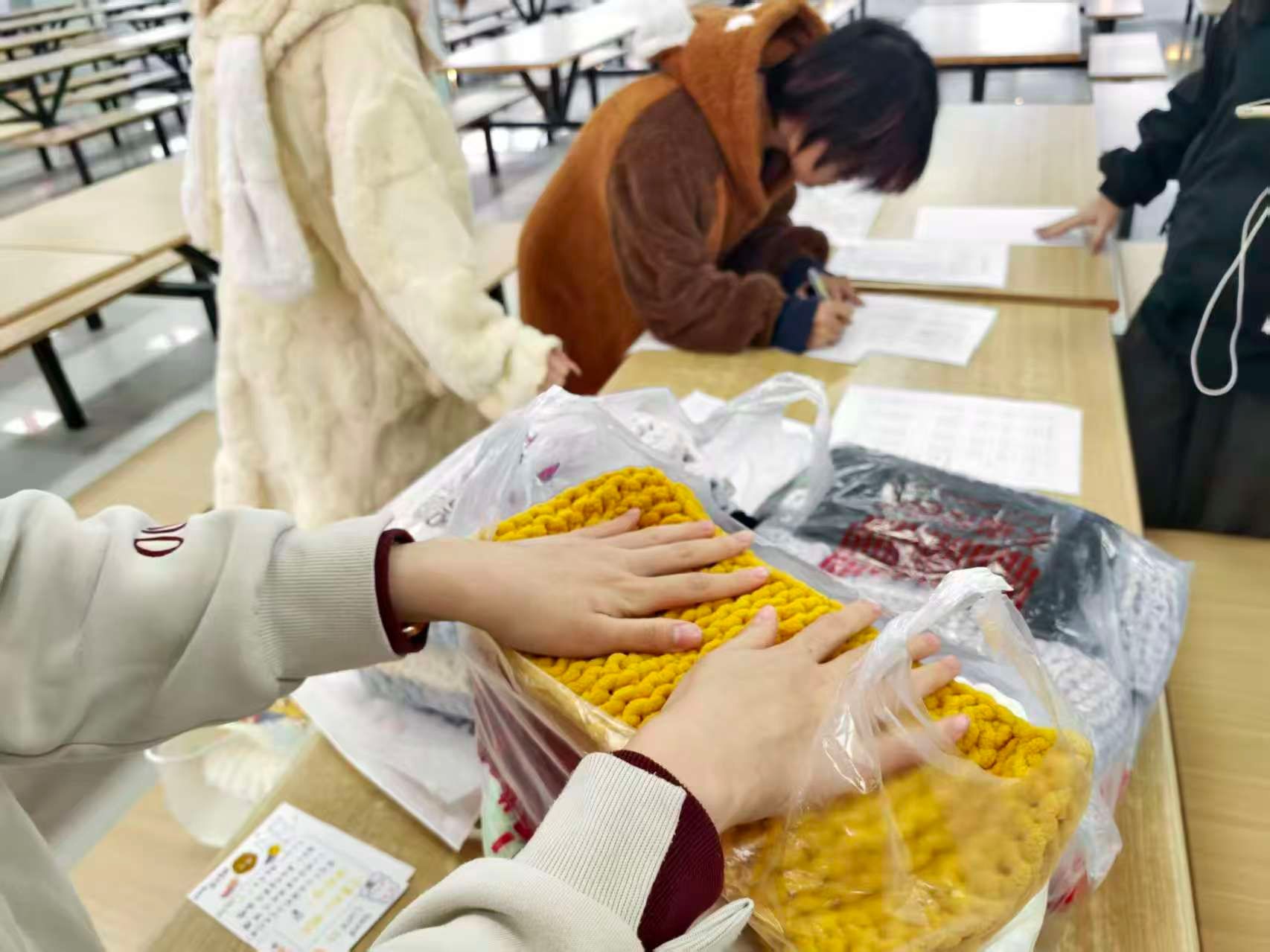 的组织下,打包好的织物被仔细分类。同学们用手轻抚柔软的毛线,仿佛在确认这份温暖能否抵御寒冬。每一条围巾,都承载着大学生们的巧思与心意。这些凝聚着爱意的物品,即将踏上“温暖之旅”,奔赴需要它们的地方。11月31日,志愿者们完成了所有织物的分类、打包工作,将凝聚着爱心的围巾、帽子及明信片分别寄往河南省商丘市睢阳区宋集镇沙沃刘小学、四川省内江市市中区电建初级中学校(小学部)以及河南省商丘市睢阳区宋集镇颜集小学。