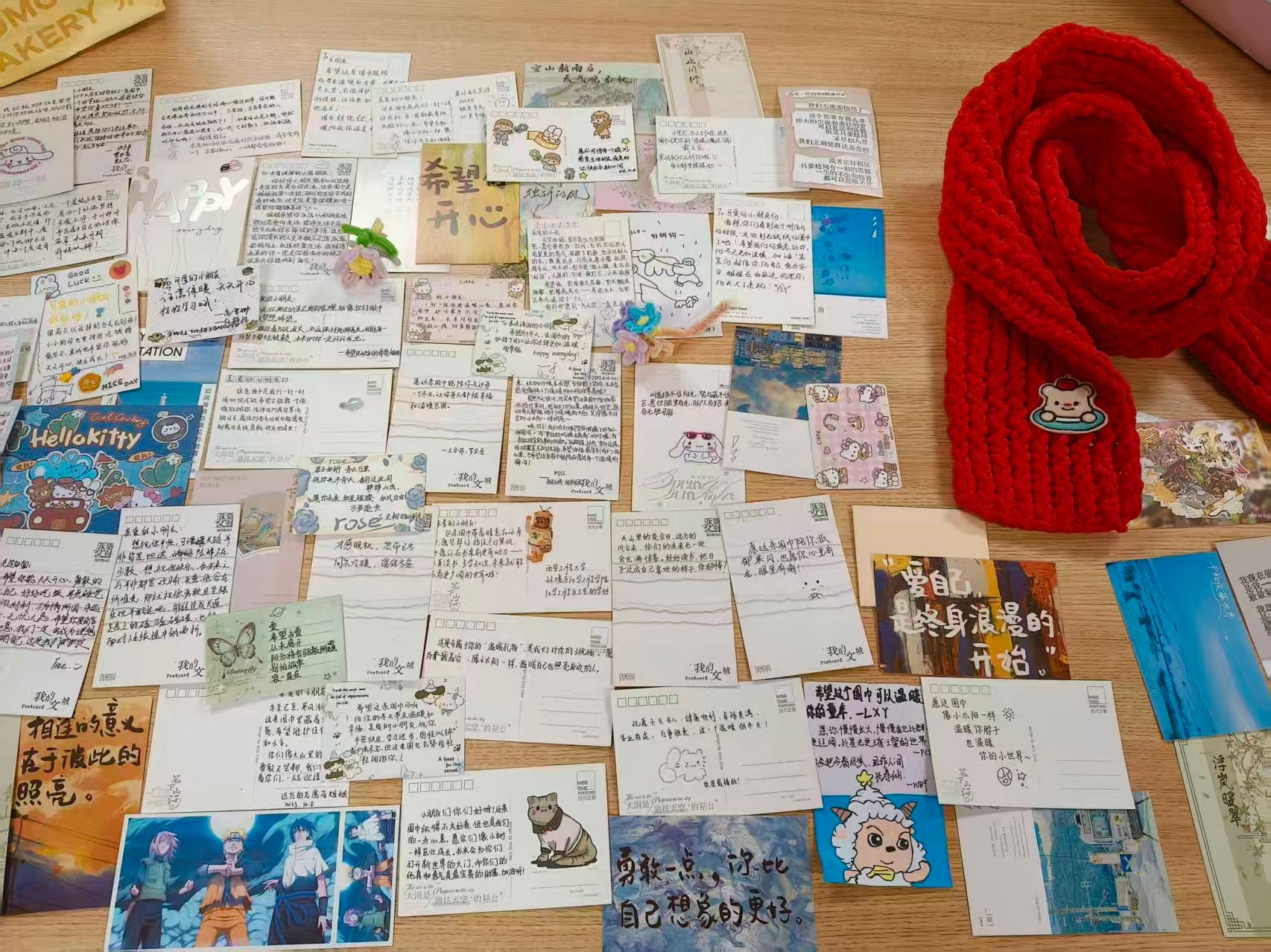 提供毛线为远方的孩子们准备“温暖包裹”。他们书写一张张明信片上,手写的祝福语与卡通插画相映成趣:“勇敢一点,你比自己想象的更好”“相逢的意义在于彼此照亮”,字里行间满是温情。