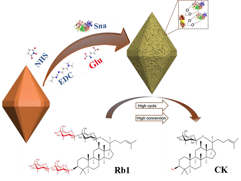 在生物催化体系构建与性能强化方面,课题组围绕酶催化过程中稳定性不足与难以重复利用等关键问题,开展了基于功能化金属有机框架材料的固定化策略研究。通过引入天然谷氨酸对铁基金属有机框架材料MIL-88B (Fe)进行表面修饰,构建新型复合载体体系,并结合共价接枝方法实现酶分子的高效固定化。该研究创新性地利用有机配体调控载体界面化学环境与空间结构,有效改善了酶分子微环境与构象稳定性,克服了传统游离酶体系在工业应用中的局限性,为稀有人参皂苷CK的绿色高效制备提供了重要技术路径。研究成果以“Immobilization of snailase on glutamate modified MIL-88B(Fe) to efficiently convert the rare ginsenoside CK with high enzyme recyclability and stability”为题发表于国际期刊《International Journal of Biological Macromolecules》(中科院一区TOP,IF 7.7),曹翠博士为第一作者,武占省教授为通讯作者,国产无码 为通讯单位。