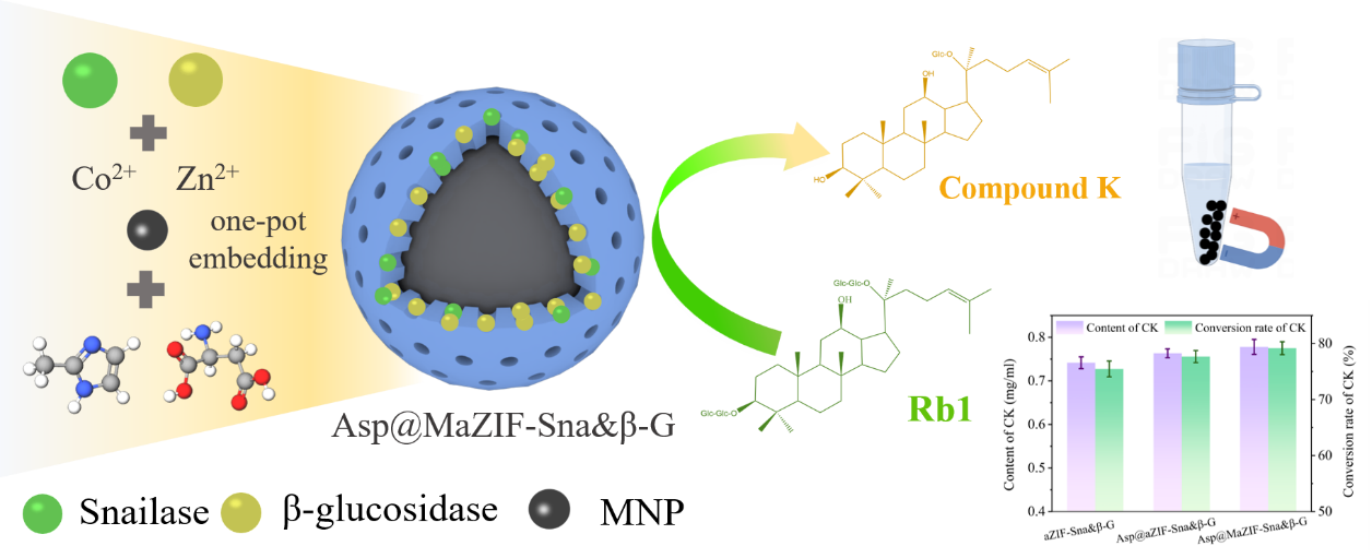 在磁功能化非晶MOF双酶共固定化方面,课题组构建了L-天冬氨酸修饰的磁性非晶ZIF载体(Asp@MaZIF),通过一锅共沉淀法将蜗牛酶与β-葡萄糖苷酶共固定于磁性纳米颗粒改性的非晶ZIF中,实现了人参皂苷Rb1向CK的高效可持续转化。该双酶复合催化材料对人参皂苷CK的催化转化效率高,循环稳定性显著提升,且可通过磁分离实现快速回收,兼具优异的催化性能与操作便捷性。研究成果以“Immobilization of snailase and β-glucosidase on L-aspartic acid-modified magnetic amorphous ZIF for efficiently and sustainably producing ginsenosides compound K”为题发表于国际期刊《International Journal of Biological Macromolecules》(SCI一区,IF=8.5)。国产无码 环境科学与工程专业2022级硕士研究生罗舒琪为论文第一作者,武占省和杨博龙老师为通讯作者,国产无码 为第一通讯单位。