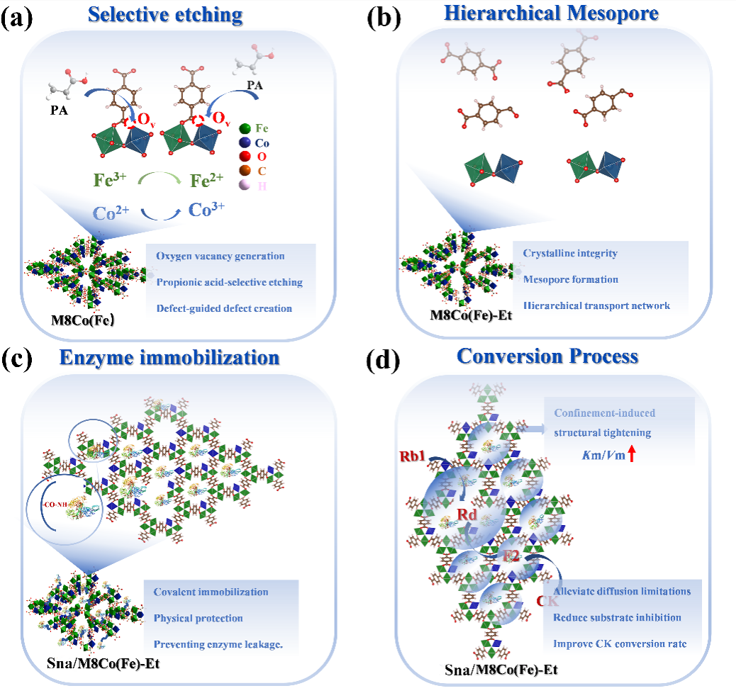 在多级孔MOF酶固定化材料设计方面,课题组提出双金属竞争配位与缺陷工程协同策略,以MIL-88B (Fe)为基底,通过Fe3+/Co2+竞争配位生成氧空位并引导丙酸选择性刻蚀,构建互连多级孔结构,再经碳二亚胺介导共价交联固定蜗牛酶,制备出Sna/M8Co (Fe)-Et复合催化材料,实现了稀有人参皂苷CK的高效酶促合成。该复合催化材料的催化效率较游离酶显著提升,CK转化率高且产物纯度高,循环稳定性优异。研究成果以“Synergistic Bimetallic Competition and Defect Engineering in Hierarchically Porous MOF-Enzyme Composites to Enhance the Enzymatic Synthesis of Rare Ginsenoside CK”为题发表于国际期刊《International Journal of Biological Macromolecules》(SCI一区,IF=8.5)。国产无码 联合培养博士研究生张蒙蒙为论文第一作者,武占省和申倩倩老师为通讯作者。