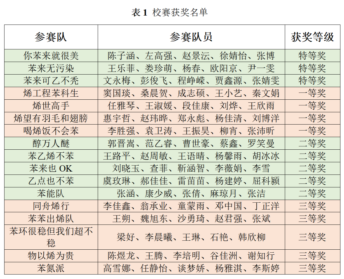 成功举行。本届校赛共有17支参赛队伍,再创新高,本次校赛,旨在为同学们搭建展示自我、交流学习的舞台,检查大家的工作进度和内容,基于此来选拔优秀的队伍冲击更高层级的比赛。经过同学们不懈努力,17支参赛队均按时提交了作品,经过各位指导老师评审,共有3支参赛队荣获校级特等奖;4支参赛队荣获校级一等奖;5支参赛队荣获校级二等奖;5支参赛队荣获校级三等奖(具体获奖名单见表1,排名不分先后)。获得特等、一等和二等奖的参赛队将继续打磨作品,继续参加化工设计竞赛省赛和西北赛区赛,预祝他们取得好成绩!